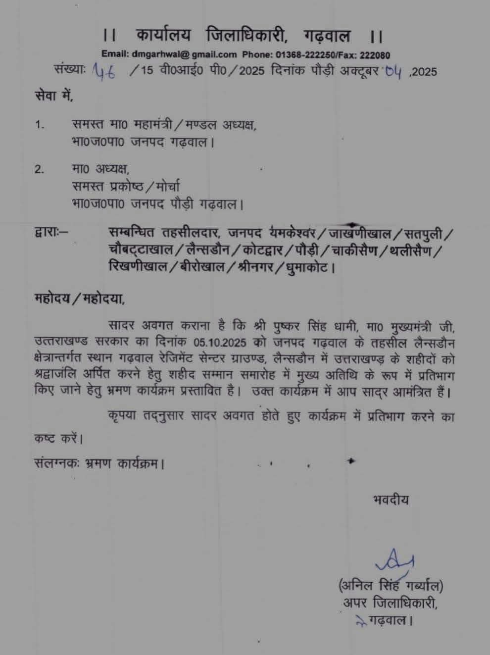 हालांकि, सोशल मीडिया पर वायरल एक पत्र ने इस समारोह की छवि धूमिल कर दी है। जिलाधिकारी (डीएम) कार्यालय पौड़ी गढ़वाल से जारी होने का दावा करने वाले इस पत्र में तहसीलदारों और अन्य प्रशासनिक अधिकारियों को निर्देश दिया गया है कि वे केवल भाजपा के जिला और मंडल स्तर के नेताओं को आमंत्रित करें। पत्र में जनप्रतिनिधियों, सामाजिक संगठनों या बुद्धिजीवियों का कोई उल्लेख नहीं है। पत्र की कॉपी में डीएम कार्यालय का लोगो, ईमेल ([email protected]) और फोन नंबर (01368-22250) स्पष्ट रूप से दिखाई दे रहे हैं, साथ ही तारीख 5.10.2025 अंकित है।