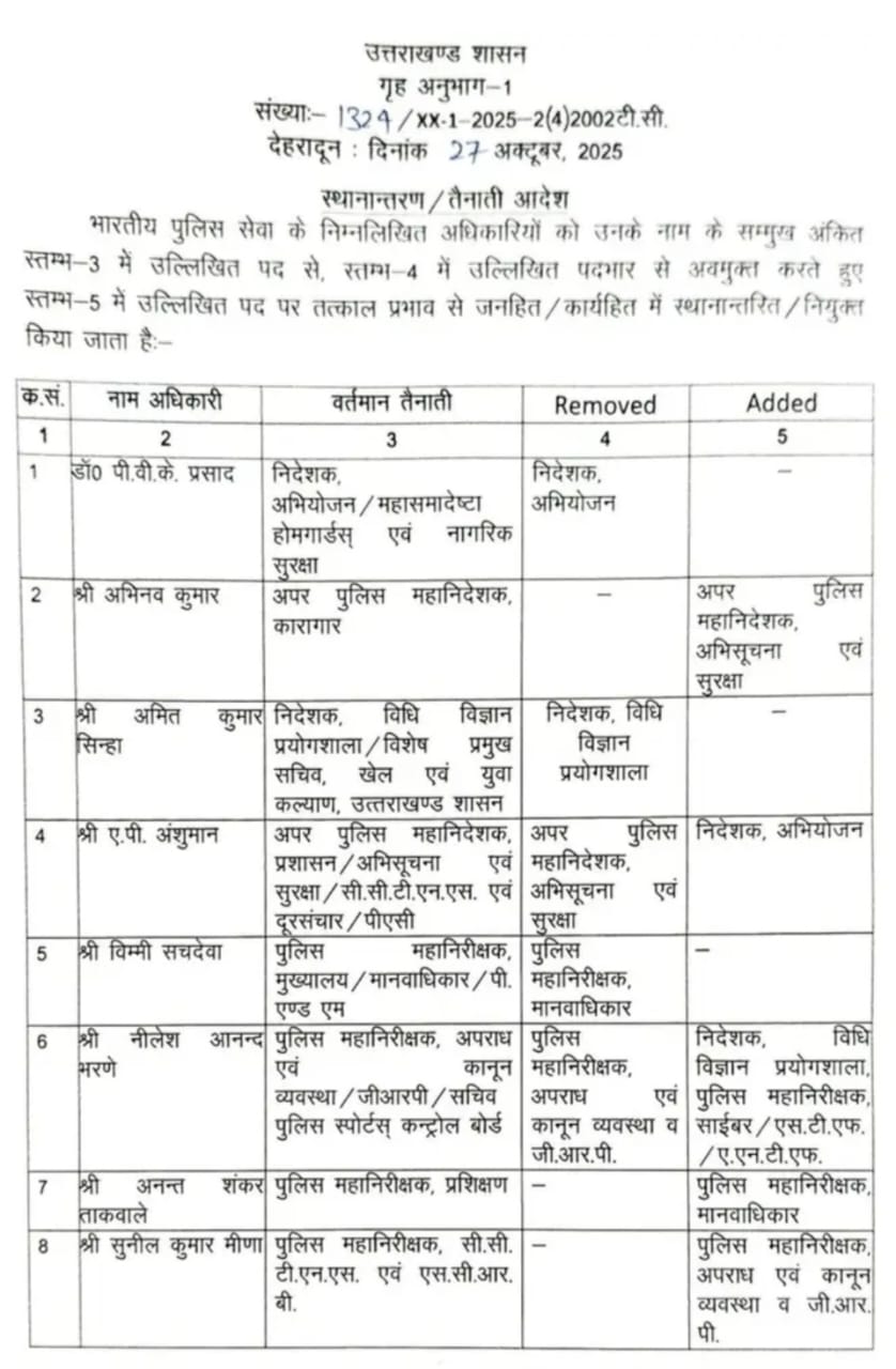 • अभिनव कुमार, अपर पुलिस महानिदेशक, कारागार — अब एडीजी अभिसूचना एवं सुरक्षा नियुक्त।